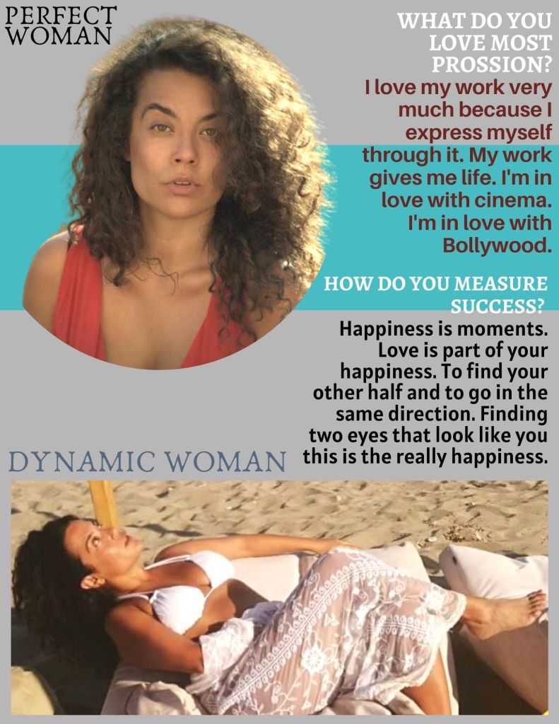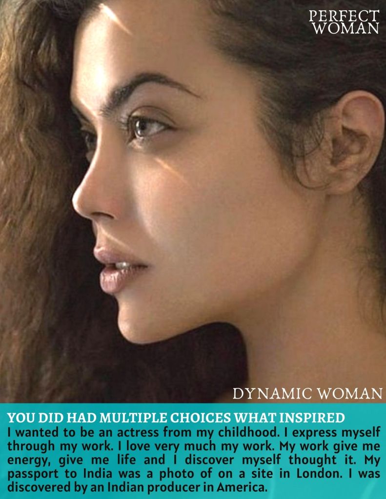 I wanted to be an actress from my childhood. I express myself through my work. I love very much my work. My work give me energy, give me life and I discover myself thought it. My passport to India was a photo of on a site in London. I was discovered by an Indian producer in America.